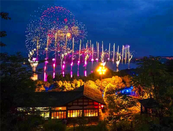 將繽紛煙花湖映長(zhǎng)壽不夜天;