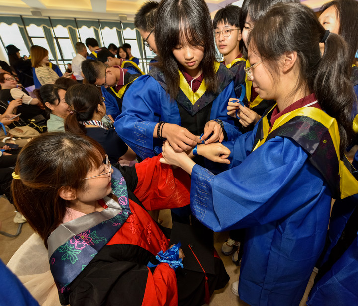 畢業(yè)典禮仍然注重強(qiáng)烈的儀式感,是繼星空節(jié),篝火晚會(huì)之后,初三孩子們生命歷程中第一次告別的重要記憶。師生們都盛裝出場(chǎng),學(xué)生穿黑色全套仿學(xué)士服,校長(zhǎng)們穿校長(zhǎng)服,和班主任們穿紅色仿博士服,科任老師穿職業(yè)正裝。既拍個(gè)人照,拍集體合影,還出動(dòng)無(wú)人機(jī)空中拍照和錄視頻。學(xué)校請(qǐng)的攝影師團(tuán)隊(duì),家委會(huì)請(qǐng)的攝影師們,還有用手機(jī)拍錄的家長(zhǎng)們,都忙著搶占最佳位置。以浪漫的形式快樂(lè)地展示自己的美,并從中體驗(yàn)生活的快樂(lè),領(lǐng)悟生活的意義,學(xué)習(xí)制造快樂(lè)的能力。這難道不是又一次生命教育?