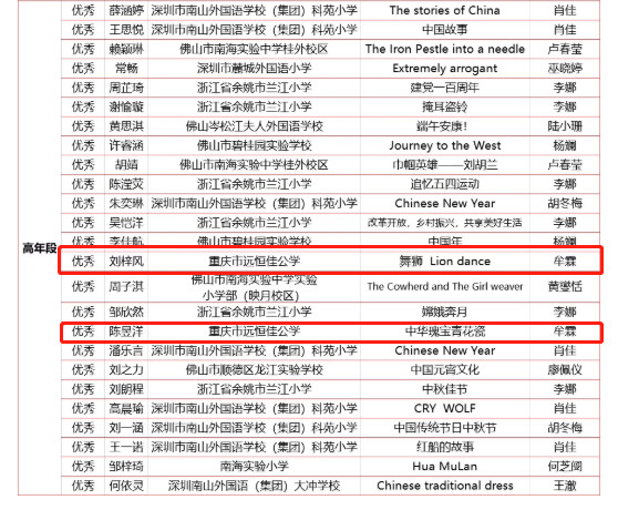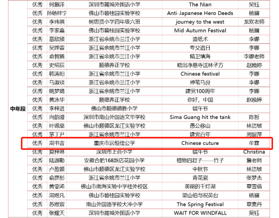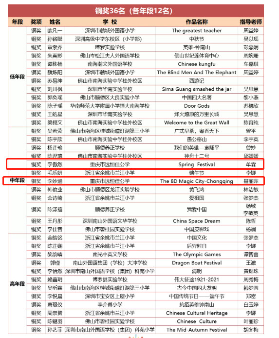 為弘揚(yáng)中華優(yōu)秀文化,提高廣大學(xué)生英語學(xué)習(xí)趣味。2021年暑假,重慶市遠(yuǎn)恒佳學(xué)校小學(xué)部英語組組織學(xué)生參加了新啟翔圖書聯(lián)合粵港文化教育交流發(fā)展中心、A100教學(xué)聯(lián)合舉辦“用英語講中國故事”第一屆全國小學(xué)生英語手抄報(bào)風(fēng)采展示活動(dòng)。本次我校共有28名同學(xué)參加比賽,其中,李傲然同學(xué)、李妙涵同學(xué)榮獲中年段銅獎(jiǎng);周書言同學(xué)榮獲中年段優(yōu)秀獎(jiǎng);劉梓風(fēng)同學(xué)、陳昱洋同學(xué)榮獲高年段優(yōu)秀獎(jiǎng)。聶麗萍老師、牟霖老師榮獲優(yōu)秀指導(dǎo)教師獎(jiǎng);重慶市遠(yuǎn)恒佳學(xué)校榮獲優(yōu)秀組織獎(jiǎng)。