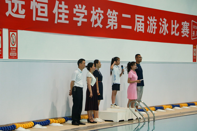 “歡迎大家來到遠(yuǎn)恒佳學(xué)校第二屆游泳比賽現(xiàn)場(chǎng)!我是本次比賽的主持人吳老師!……在這炎炎夏日里,房間里的空調(diào)也難以冰鎮(zhèn)我們心中的燥熱,索性就暢游水魔方吧!讓身體成績一起棒起來!……”