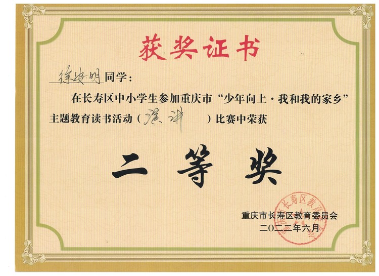 • 少年至上——重慶市“少年向上·我和我的家鄉(xiāng)”主題讀書(shū)活動(dòng)征文比賽(中學(xué)組)二等獎(jiǎng)
