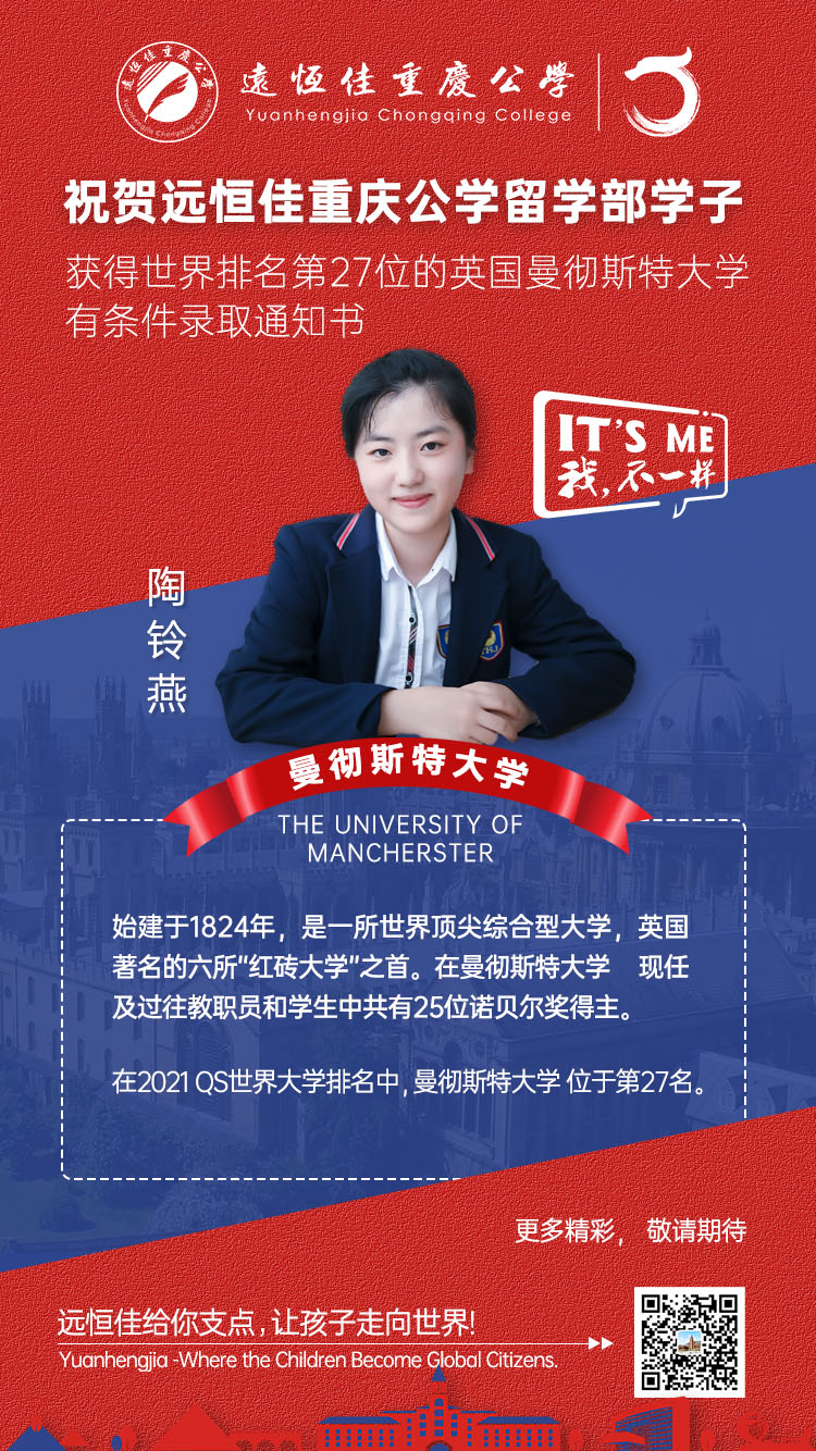 美好學(xué)生| 遠(yuǎn)恒佳重慶公學(xué)留學(xué)部陶鈴燕同學(xué)獲世界排名第27的英國(guó)曼徹斯特大學(xué)預(yù)錄通知書(shū)!