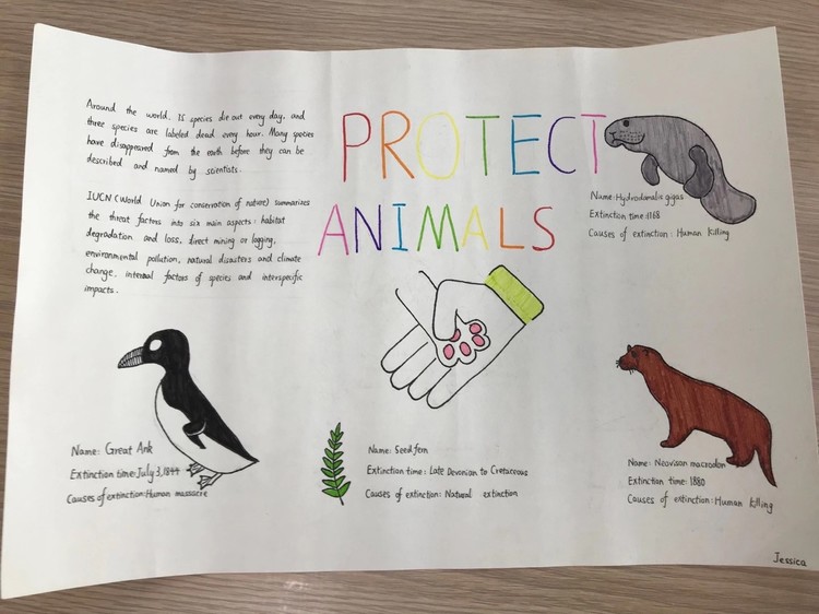 項目式教學是在教師指導下,以學生為中心,通過完成一個完整的實踐性項目而進行的教學活動。它要求學生運用已有知識和經驗,通過親手操作,在具體情境中解決實際問題,進而促進綜合能力的發(fā)展。項目可以是設計與制作一件產品、排除一個障礙、提供一項服務、解決一個問題或宣傳一個理念等。遠恒佳留學部學生,利用海報概括一個歷史時代;生物課宣傳保護環(huán)境或動物的想法;經濟科可以宣傳一帶一路等國家政策。同學們通過畫筆表達自己對所學知識的理解。