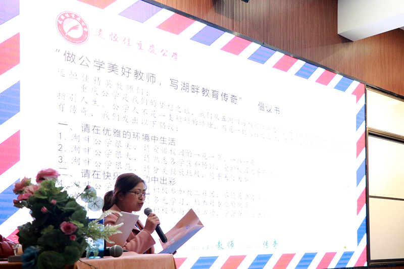 接著,湖畔書院院長助理劉莉老師宣讀“做公學美好教師,寫湖畔教育傳奇”的倡議書,遠恒佳精英教師們不是一支短短的蠟燭,而是一把閃耀的火炬,立志帶領(lǐng)莘莘學子在優(yōu)雅的環(huán)境中生活,在快樂的活動中出彩,在多元的文化中成長,在高端的平臺上進步,在正確的選擇后奔跑,在溫暖的交往中育人。