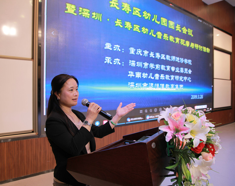 參加本次活動的有:長壽區(qū)教委副主任趙明,長壽區(qū)教師進修學校校長余信華,長壽區(qū)教育委員會成職教科科長張蕓葫,長壽區(qū)示范幼兒園書記、園長高俊英,長壽區(qū)示范幼兒園視導員李萍,深圳市學前教育專業(yè)委員會秘書長郭瓊女,深圳市名師、中國早期兒童音樂舞蹈教育發(fā)展和研究中心——華南研究中心負責人、深圳市音樂教育學科帶頭人陳碧琴老師和她工作室的老師們,深圳市遠恒佳教育集團副總裁麥麗芬女士,深圳市遠恒佳教育集團董事長助理、副總裁程琳娜,深圳市資深優(yōu)秀園長、遠恒佳教育集團幼教中心教學總監(jiān)唐玉萍,遠恒佳教育集團學前管理中心重慶分部主任彭家敏。教研會由長壽區(qū)教師進修學校幼教教研員鄧勇主任主持。