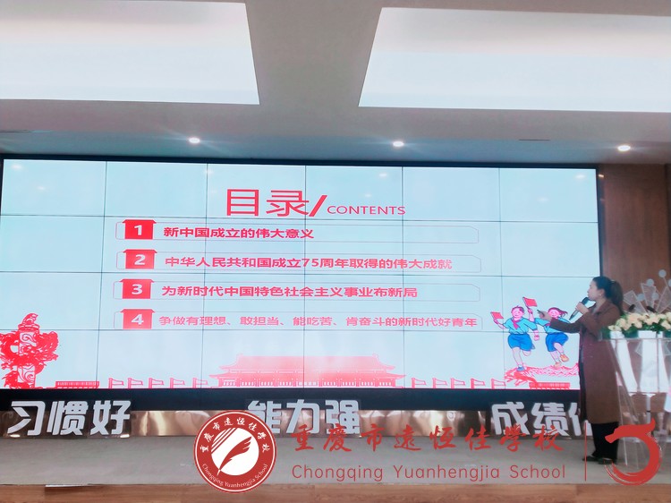 悠悠歲月,見(jiàn)證偉大歷程;歷史長(zhǎng)河,奏響壯麗樂(lè)章。為慶祝中華人民共和國(guó)成立75周年,致敬偉大祖國(guó),弘揚(yáng)愛(ài)國(guó)主義精神,夯實(shí)青年信仰之基、擔(dān)當(dāng)之責(zé)、奮進(jìn)之力。重慶市遠(yuǎn)恒佳學(xué)校于2024年11月7日在龍行廳開(kāi)展“青春與祖國(guó)共成長(zhǎng)”主題團(tuán)課學(xué)習(xí),學(xué)校辦公室主任、高中部德育主任、團(tuán)委書(shū)記龔朝蓮主講,各班團(tuán)員和入團(tuán)積極分子百余人參會(huì)。