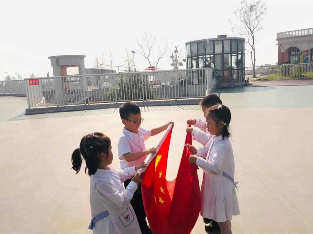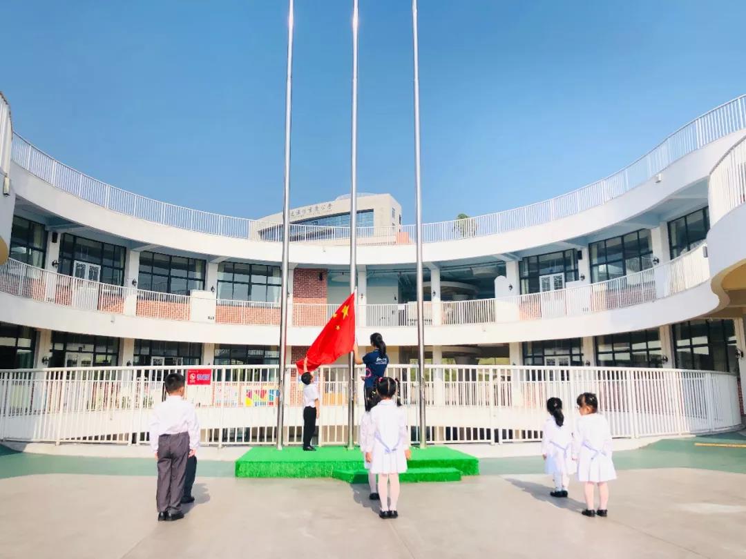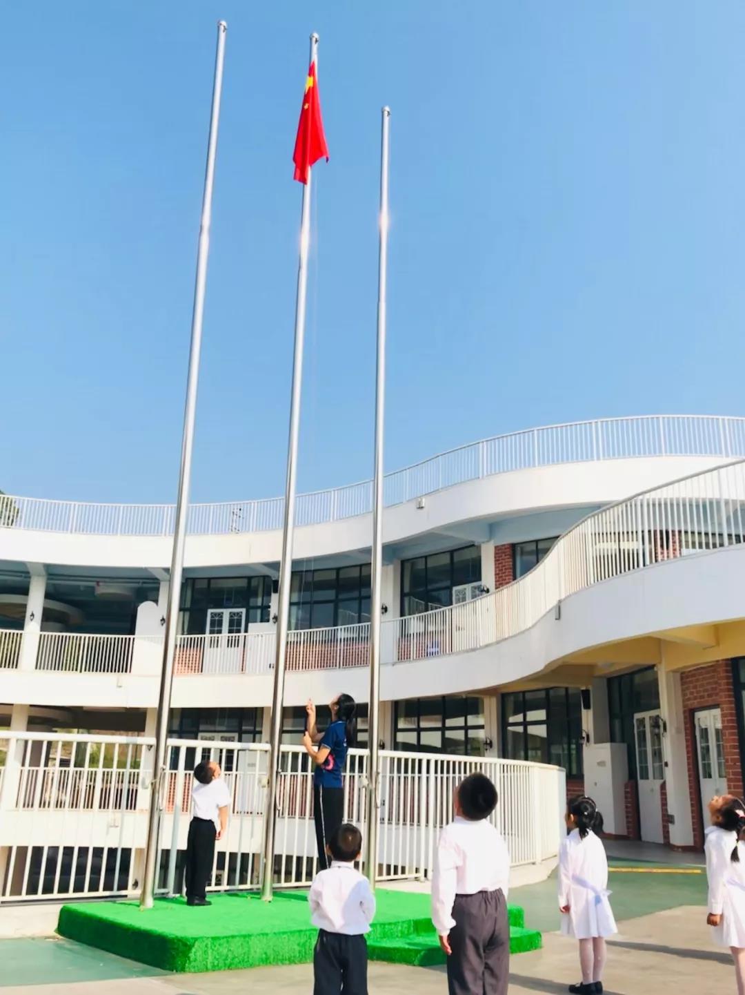 鮮艷的五星紅旗冉冉升起,在燦爛的陽光里迎風飄揚,老師和小朋友伴隨樂曲唱起國歌,歌聲雖然稚嫩但依然嘹亮。