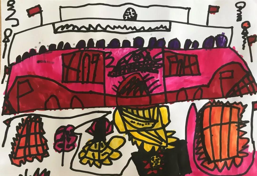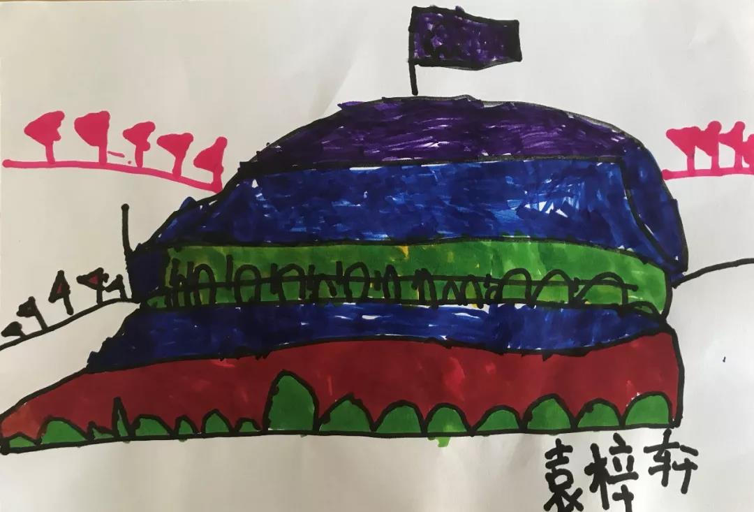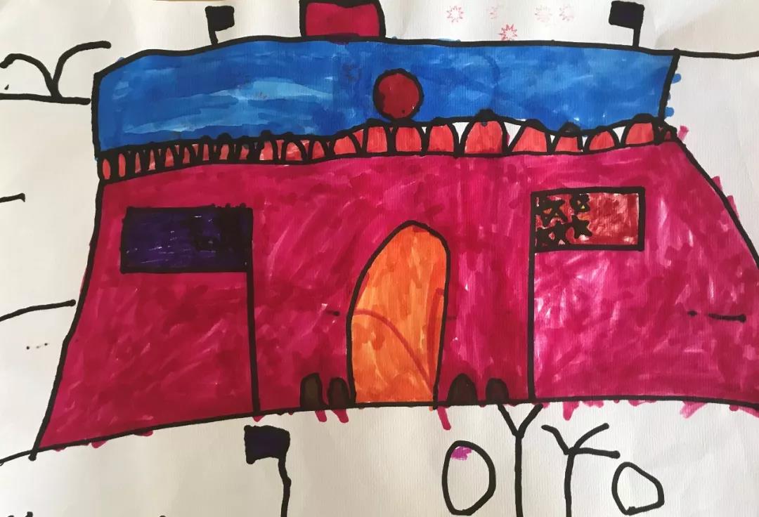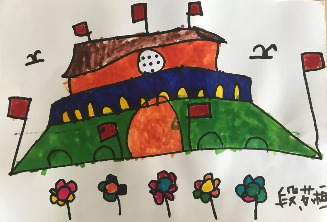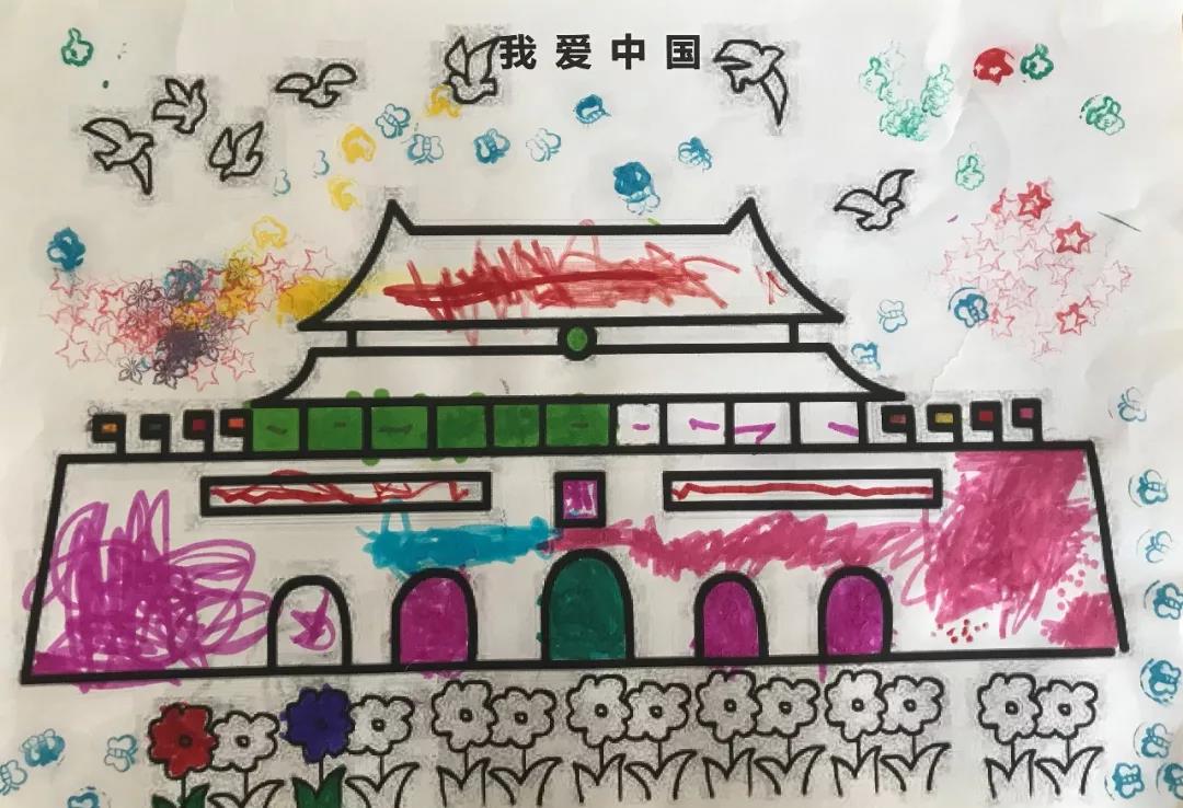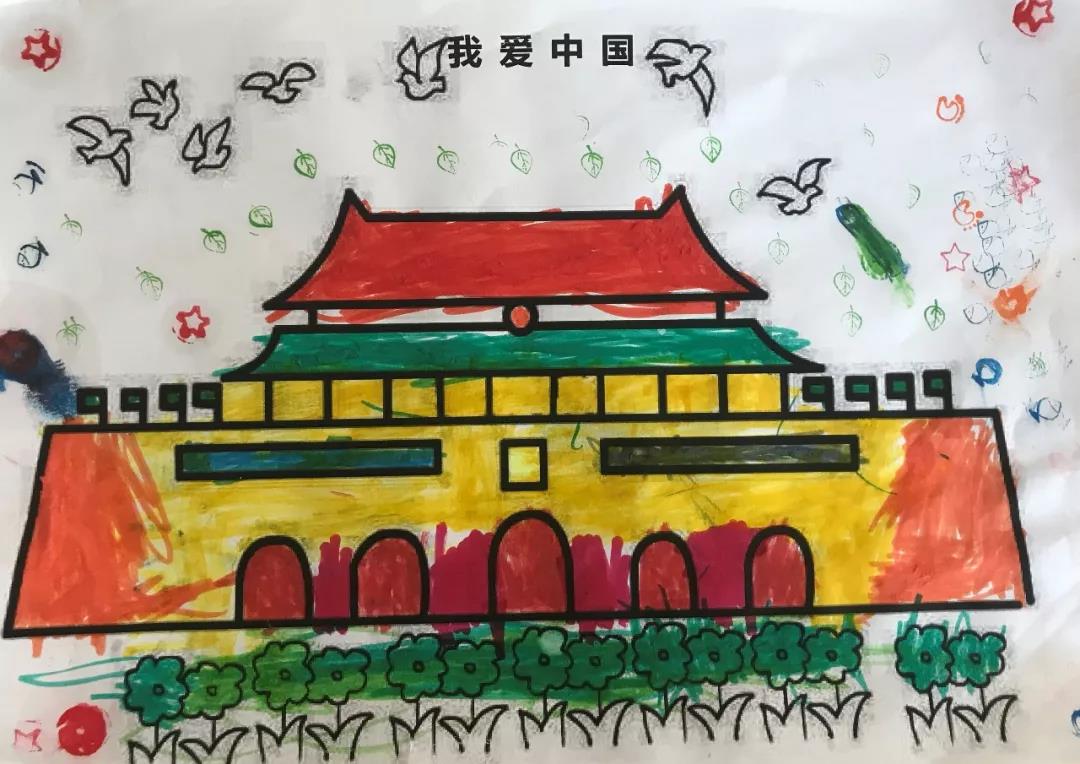 通過談話活動孩子們知道北京是中國的首都,北京有個象征中國的地方是天安門。觀察天安門的顏色、構造,孩子們細心的返現(xiàn)天安門城門上有國徽、有毛主席像、有拱門、有金色的屋頂,還有兩行字呢......,于是他們開始繪畫創(chuàng)作活動。