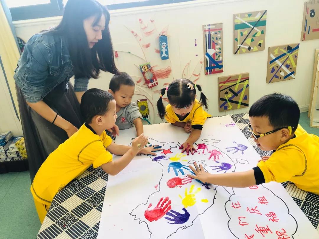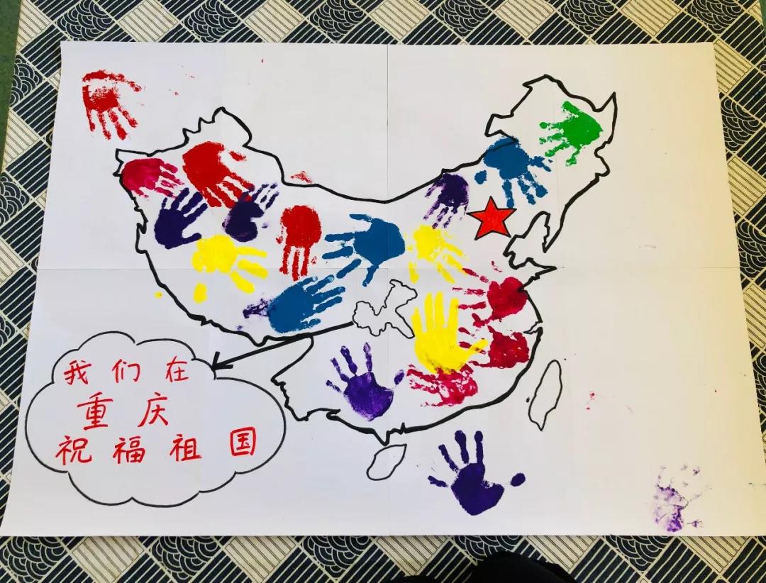 “重慶是直轄市,我是重慶娃。這座城市有很多的高樓、有我喜歡的游樂場,有很多愛我的人,生活在這里我很幸福?!?孩子們在地圖上找出“首都北京”和“家鄉(xiāng)重慶”的位置,印下自己的手掌印。