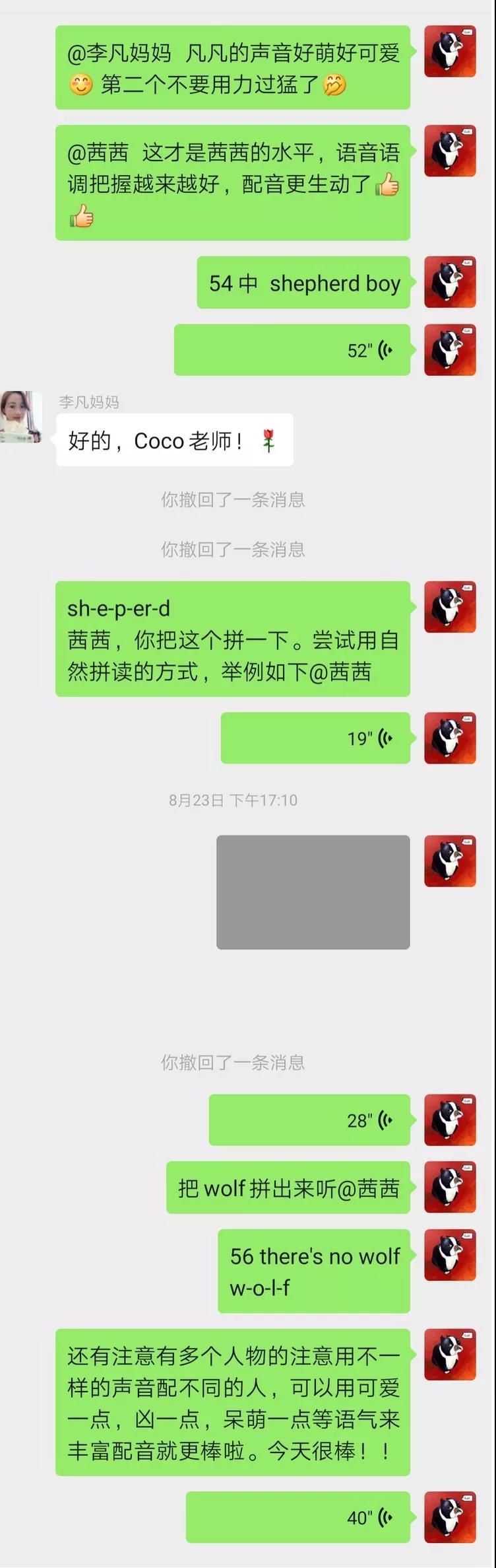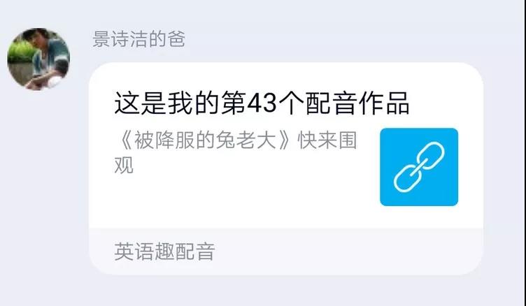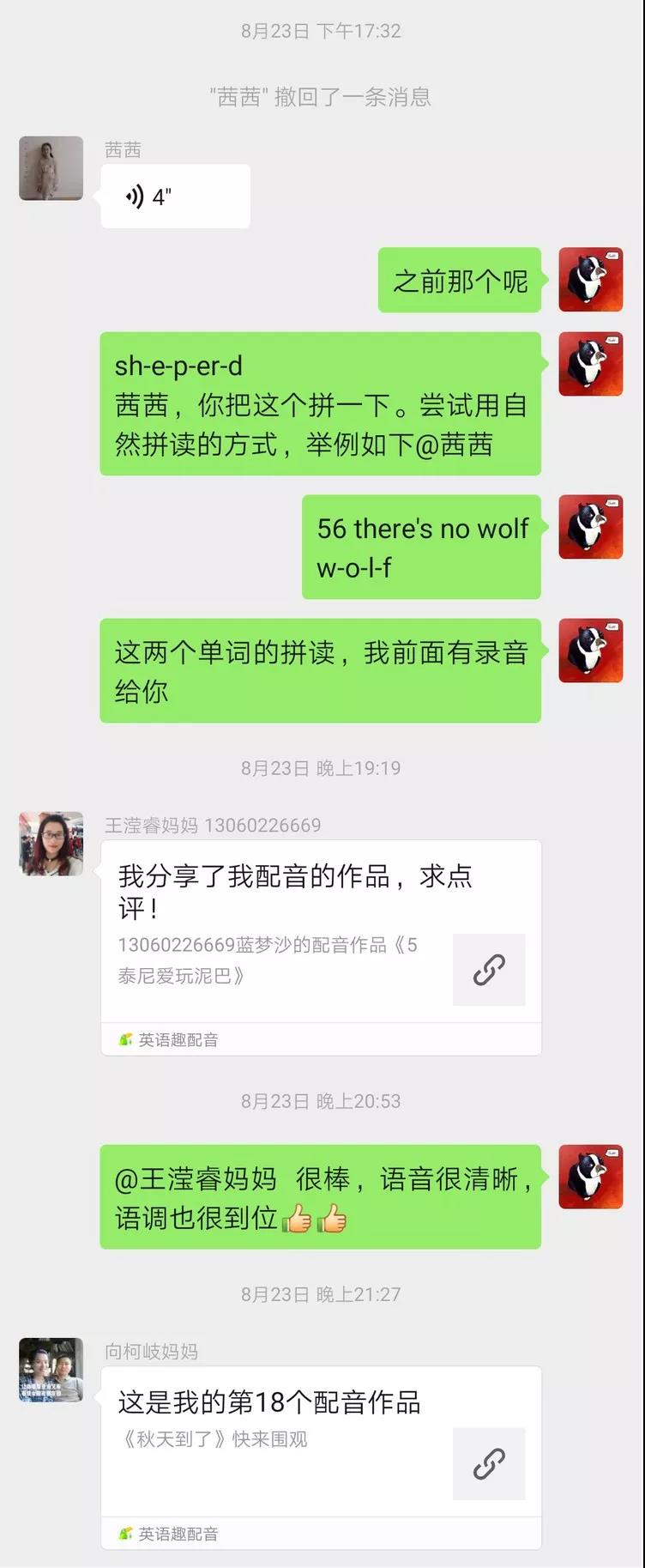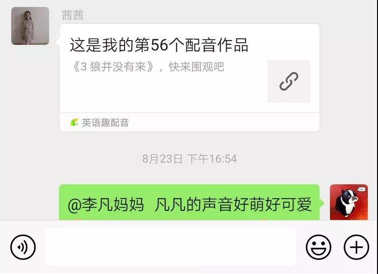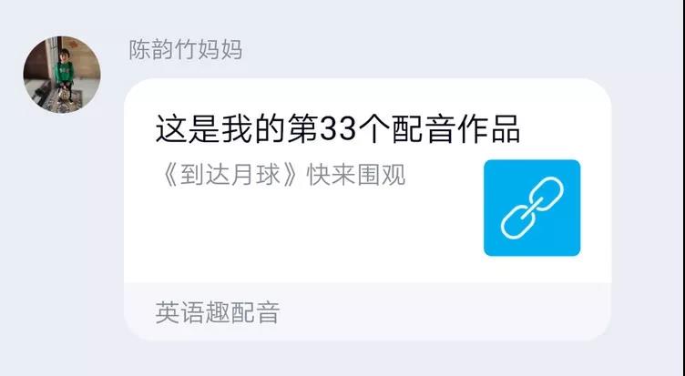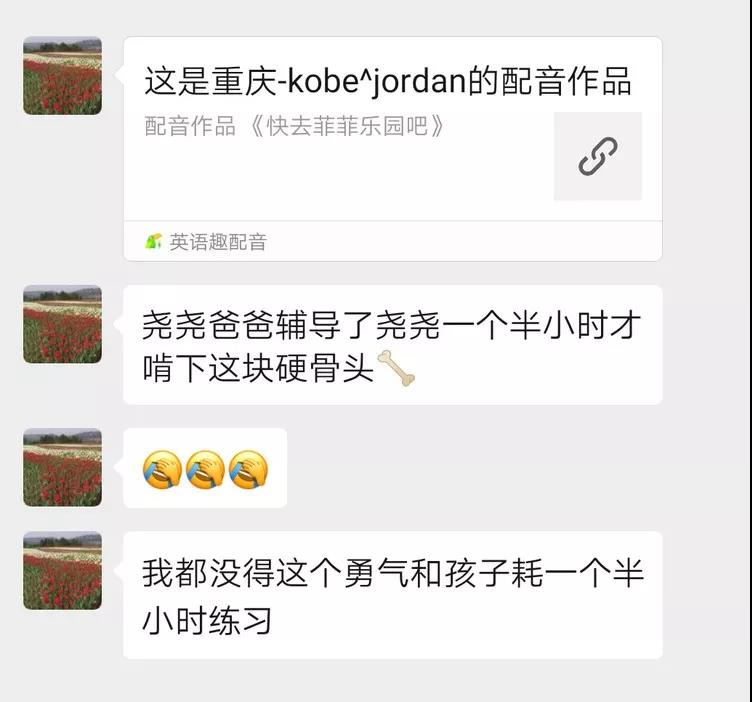 最讓人嘆為觀止的是二年級的邢梓堯同學(xué),一段30多秒的配音,竟然和他爸爸一起練習(xí)了一個多小時,還有的家長為了給孩子營造良好的氛圍,主動與孩子分角色共同配音。我們的老師,有多少段配音,就有多少回復(fù)。哪個音沒讀準,哪句語調(diào)沒對,我們的老師們都不厭其煩地為其糾正,指導(dǎo)。